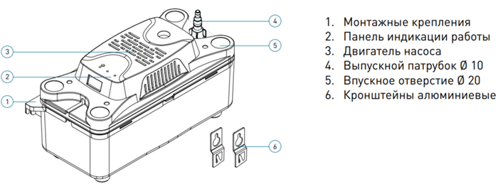 Применяется для отвода конденсата у систем кондиционирования средней и высокой производительности. Дренажные насосы наливного типа используются в случаях, когда невозможна скрытая установка помпы (в штробу). Основным преимуществом данного типа помп являются большая производительность и возможность подключения до 4 приборов большой мощности. Сам насос включается и начинает работать, когда накопительный бак наполнен конденсатом. Производительность этого типа помп достигает 300-700 литров в час, но предельная высота подъема воды у них меньше, чем у помп раздельного типа – максимум 6-8 м. Вода должна попадать в помпу такого типа только самотеком (нет функции всасывания). Датчик уровня жидкости в этих помпах является встроенным.