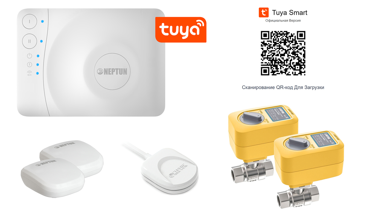 Краны Neptun PROFI 1/2" 12В – 2 шт. Датчик Нептун SW 005 – 1 шт. Радиодатчик Neptun Smart 868 – 2 шт. Модуль управления Neptun Smart+ TUYA – 1 шт. Блок питания 12В – 1 шт.