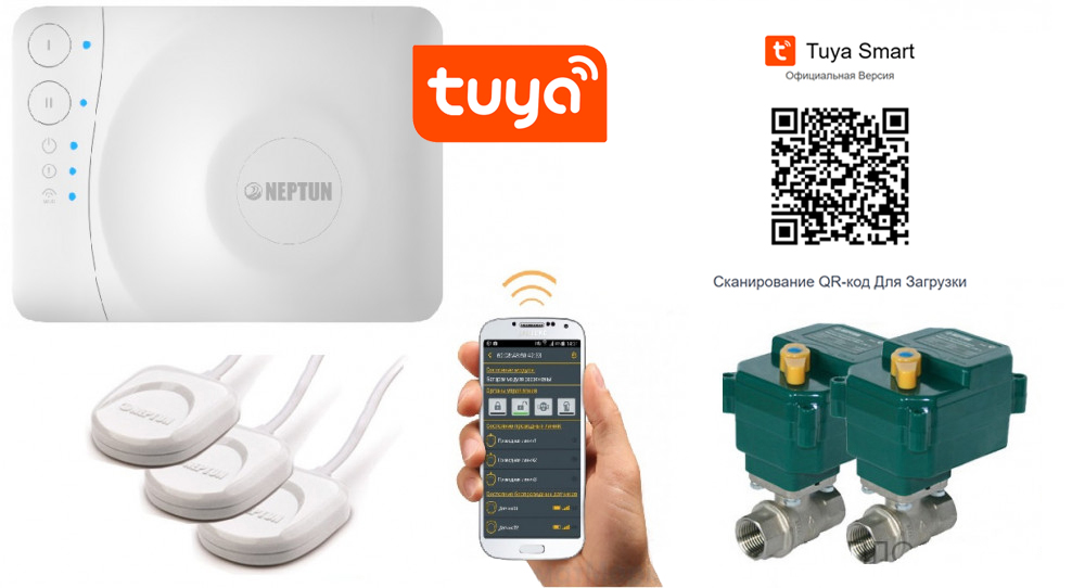 Краны Neptun Bugatti Pro 1/2" 12В – 2 шт. Датчик Нептун SW 005 – 3 шт. Модуль управления Neptun Smart TUYA – 1 шт. Блок питания 12В – 1 шт.