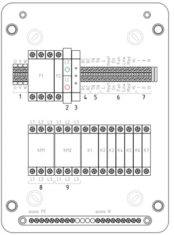 1. Подключение питания (3х380В/ГЦ). 2. Световая индикация работы/поломки аппарата. 3. Реле настройки времени отключения двигателей вентиляторов. 4. Подключение концевого выключателя. 5. Подключение датчиков системы защиты от перегрева. 6. Подключение комнатного термостата TDS. 7. Подключение двигателей вентилятора. 8. Подключение питания первой ступени нагрева ТЭНов. 9. Подключение питания второй ступени нагрева ТЭНов. |