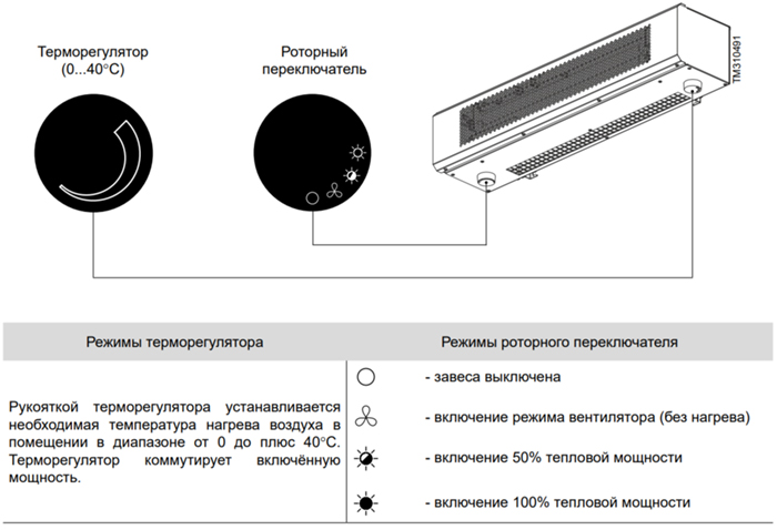 - Поворотные регуляторы (завесу можно использовать как с нагревом так и без нагрева, в режиме вентиляции).