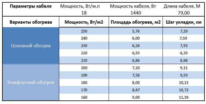 Самостоятельно высчитать какую площадь может обогреть секция нагревательного кабеля, нужно мощность секции разделить на вид обогрева (комфортный, основной или холодных помещений) и получим количество квадратных метров обогрева пола.