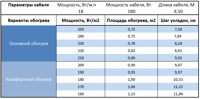 Площадь укладки при комфортном обогреве пола